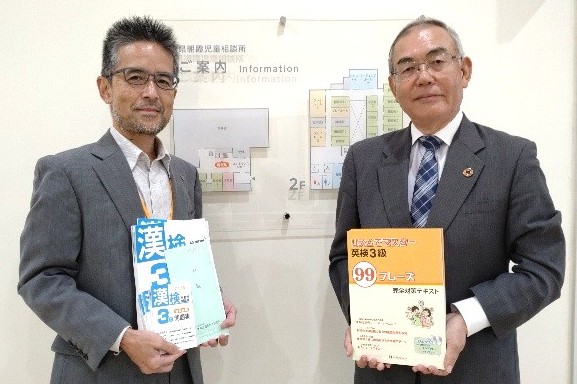 贈呈した教材は、『リズムでマスター英検完全対策テキスト』の3級・4級・5級と『分野別頻出順漢検対策問題集』の3級・4級・5級を、それぞれ1部ずつです。