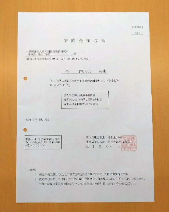 それに、当財団から50,198円を上乗せした18万円を、5月7日に社会福祉法人埼玉県社会福祉事業団様に寄付いたしました。